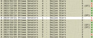 The Ottawa Senators are never a sure thing for Dallas, as you don’t need me to tell you. Go ahead, just try to remember at least one frustrating loss against the Senators. I bet you could remember one! Because there have been a lot. Here’s some recent history (Ottawa wins are indicated with a green “W” on the far right):