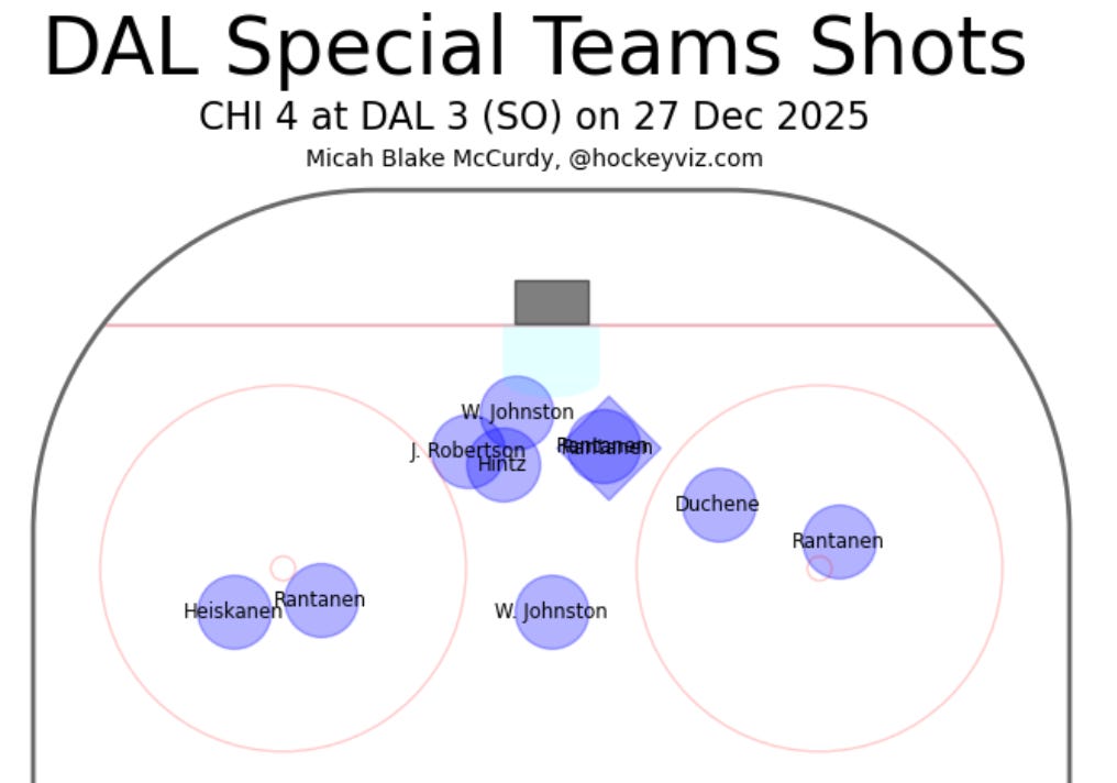 Söderblom went 10-for-10 with save attempts on four Stars power plays. And they were exclusively from below the tops of the circles. You can’t say the Stars didn’t make his job tough tonight, but credit to the Chicago goalie for pulling two points out of a weird game.