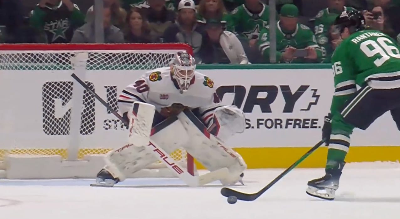 But again—again—Rantanen and company (but mostly Rantanen) created chances whose larvae got stuck in their cocoons, with multiple Grade-A shots just not getting through Söderblom. Inevitably, Chicago would get their own power play on a Jamie Benn high-sticking call.