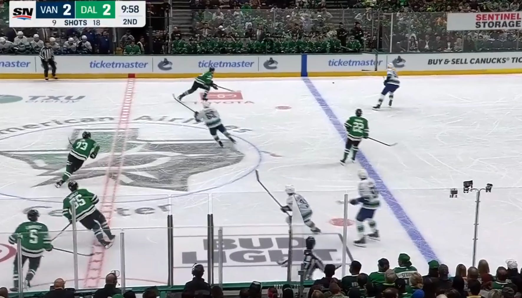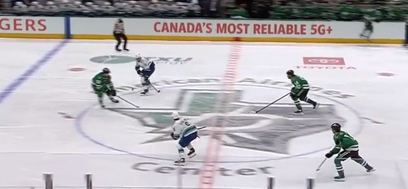 The third Canucks goal came just a minute after that, when Nils Lundkvist stepped up and threw a puck across the ice. And despite the Stars appearing to have numbers back, the play sucked a couple of players out of position, leaving Max Sasson all alone to receive a bank pass down the right wall as Harley hadn’t yet recovered to the other side, and Erne was skating toward the puck, leaving Sasson a wide open path to the net that he happily took.