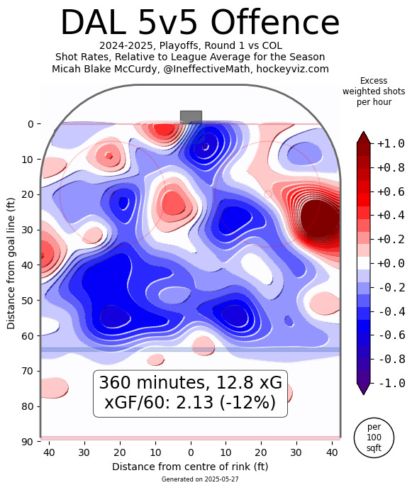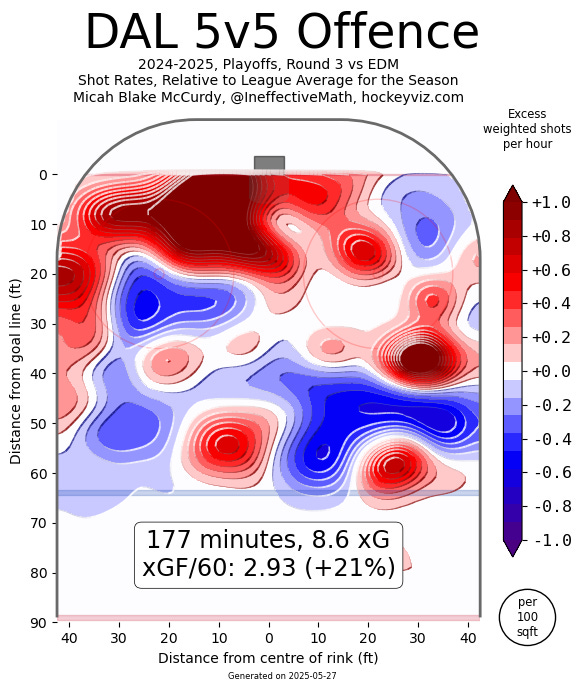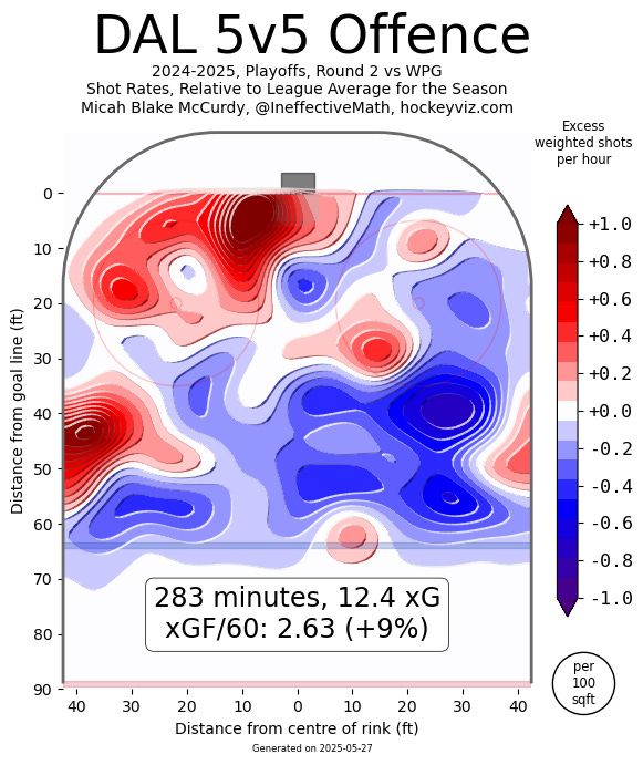 Dallas’s 5-on-5 offense has still been much more effective at getting shots from good areas in this round than against Colorado or Winnipeg, and they also have four power play goals in four games.