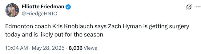 DeBoer has tinkered with the lines to try to get something going, both between and within games. But he can’t score the goals himself2, and neither can Oettinger. The Stars have spent a month finding ways to do just enough to win, but the Oilers are a team you need to beat, not just hit with you best shot. And the Stars are hitting the board rather than hitting through it, these days.