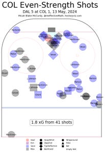 Thomas Harley made a really nice desperation play on Cale Makar at that point, with MacKinnon having fed Makar on the weak side only for Harley’s long reach to send the dangerous chances into the netting. Harley has looked more and more composed as the series has gone on, which is no small feat against the team that scared the daylights out of him in his NHL debut back in the 2020 Edmonton bubble.