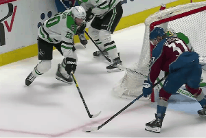 Jason Robertson was battling hard in this game early, and it was his forechecking that ended up putting Dallas up 3-0. Robertson gamely went deep against two Colorado forecheckers, but after enduring a reversal from Makar, Robertson ended up winning a puck that had bounced up high and getting it back to the point, where Miro Heiskanen sent a hopeful wrister that may have glanced off Seguin on its way in, though it was given to Heiskanen in the building.