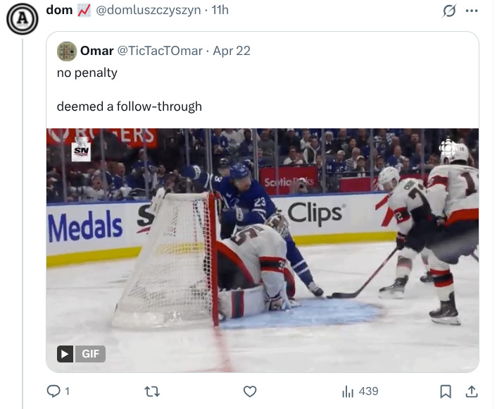 The discussion (on SportsNet as well) revolved around the fact that you can’t get penalized for a high-sticking call if it’s a “follow-through” action, as evidenced in the first round in Ottawa/Toronto.