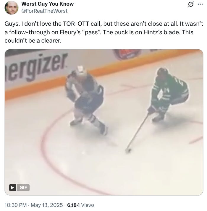 There was some talk about the penalties last night, though if you were in Dallas, you probably didn’t hear as much about it. But in Canada and elsewhere, much was made of the non-call on Heiskanen for getting his stick in Connor’s hands on that aforementioned breakaway, and yeah. This absolutely should have been a penalty, for my money.
