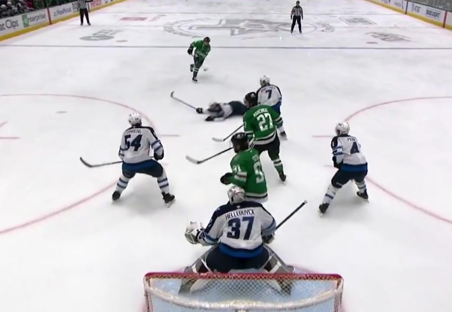 (That said, look at Heiskanen just casually beating everyone with his slick pass, here. You can already see how Hellebuyck hasn’t picked up the pass quite soon enough to get over for what will be a dagger of a one-timer for Granlund, for the hat trick.)