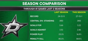 The Stars have won seven games in a row, with points in nine straight contests. They are two points ahead of their pace last season through 41 games, and they’re in…pretty much the same spot. Here’s a graphic the broadcast showed during the postgame show on Victory+: