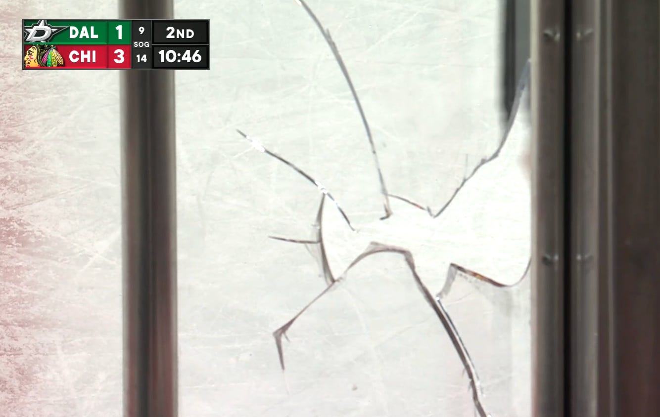 Ilya Mikheyev hit a post from the neutral zone when gunning for a hat trick with the Stars’ net empty. So I guess that counts as one bit of bad luck for Chicago, technically.