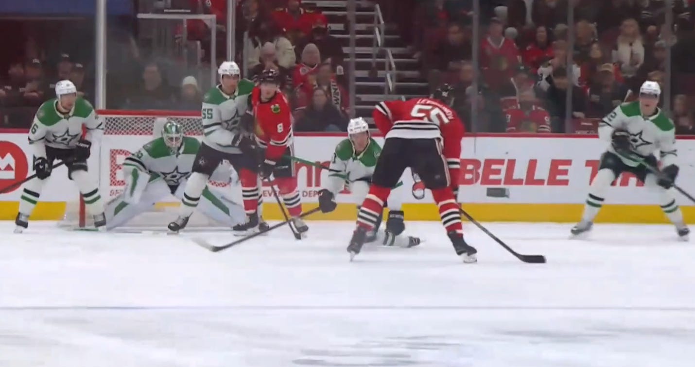 The Johnston line would later get hemmed in their own zone (after some good looks at the other end that—stop me if you’ve heard this one—didn’t get finished), and after a full two minutes of ice time that gassed 53 & 96, Justin Hryckowian tried to rush a clearance, and the puck tumbled over the glass to give Chicago its fourth power play of the game, with Dallas yet to earn one themselves.