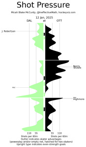In fact, as you can see from this chart, the Stars really didn’t generate much of anything after the 15-minute mark of the first period until the power play they got halfway through the second. And the mere fact that Dallas was trailing for the second half of the game, but still ended up being outshot after 60 minutes is a pretty big indicator that the Stars never really forced the Senators to pack things in and hang on beyond a bit of a bounce-back stretch late in the second period.