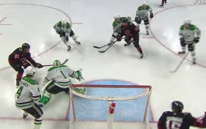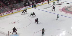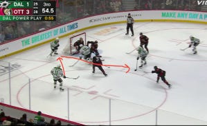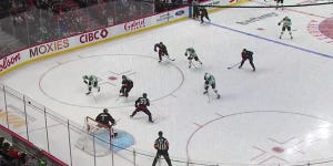 The second power play for Dallas was efficient and incisive, with Heiskanen firing a hard pass to Robertson down at the red line that he spit right back out to Hintz on the doorstep for a no-nonsense goal. You can put the pieces together yourself after the feed down to Robertson got bumped back to Hintz, who had spun to face the net and put it far side.