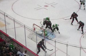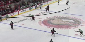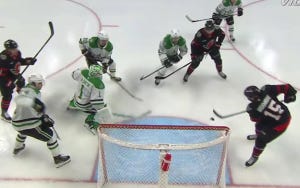 Except, hold on, never mind. Because the NHL has Offside Review, which means any goal at any time could be taken away because teams have the ability to review a zone entry from minutes before a goal, and that’s what happened here. Apparently Roope Hintz had entered the zone just the tiniest bit off-side far away from the puck, and because this league is incapable of weathering even the slightest embarrassment, now every goal carries with it the suspicion of revocation.