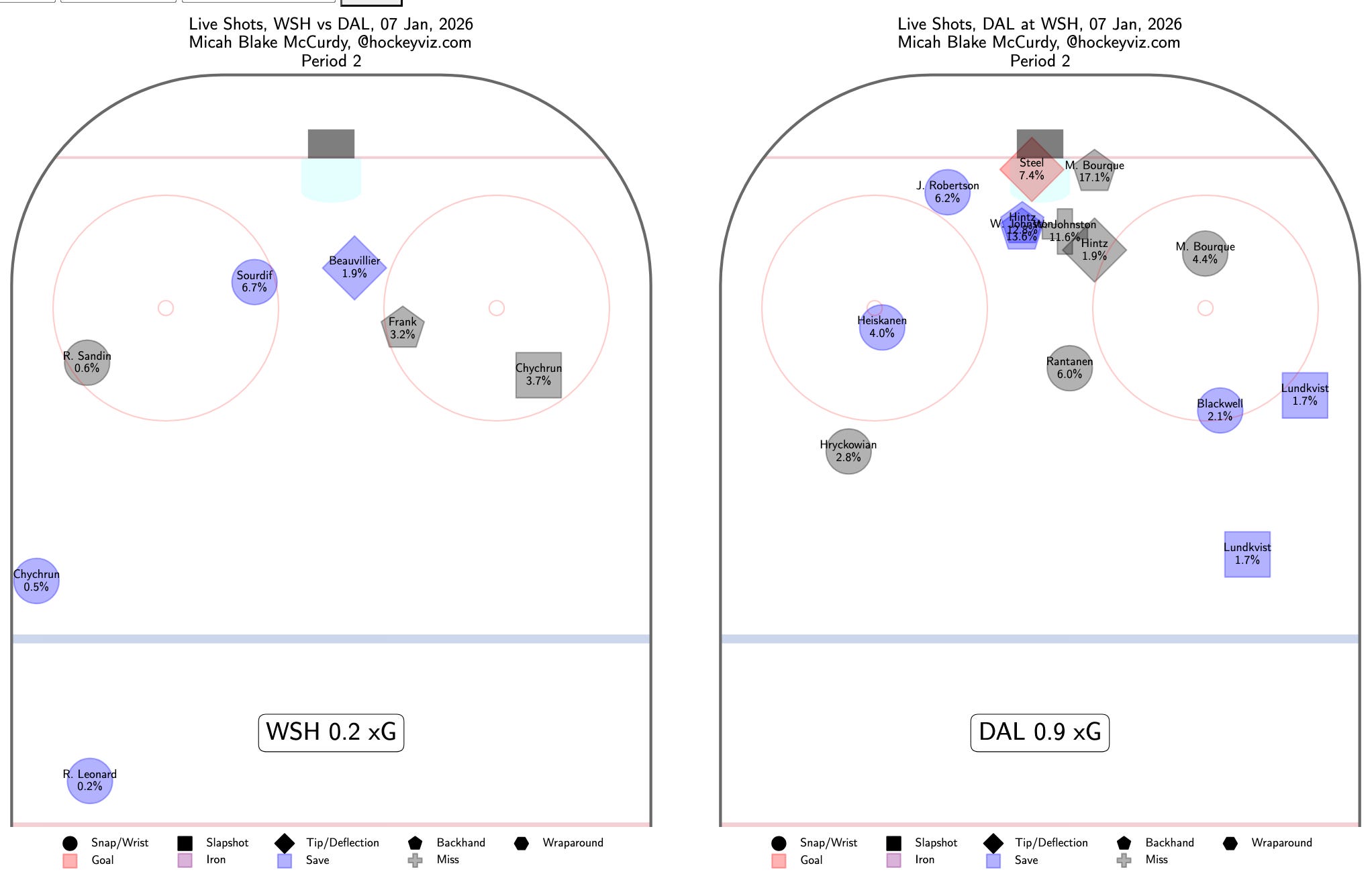Mikko Rantanen was nailed for a slashing penalty (whether or not he ought to have been) with four minutes to go in the second period, and it could’ve given the Capitals life out of a game that was largely devoid of it to that point. But Dallas came up with a dominant kill, and they took a 2-0 lead to the second intermission after holding Washington to nothing but the below shot attempts in the middle frame (including the Caps’ power play):