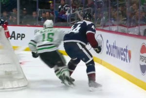 Speaking of inflicting wounds, Benn nearly did so on MacKinnon, who turned his numbers out along the boards to avoid a hit, only for Benn to solve the puzzle and get a solid hip on him anyway.