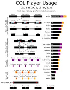 Moreover, with no Chris Tanev on the trade block this year, it remains to be seen how the Stars are going to solve this particular conundrum. But I always find myself impressed at how Girard has earned trust and respect despite being basically my height in the NHL. He really is a dependable defenseman, and Jared Bednar deserves a lot of credit for how he’s grown his defense corps into a thoroughly functional unit, whether Makar plays 30 minutes or not on any given night.