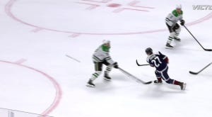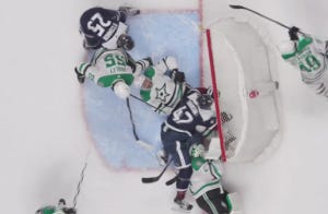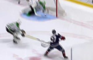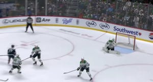Unfortunately for Dallas, even a spectacular save from DeSmith on Drouin (again, with that second line) would not be enough to inspire a comeback. Look at what DeSmith does here, diving across like a soccer goalie after Harley got nutmegged on the pass across: