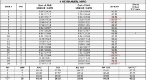 Here’s the game sheet of Heiskanen’s ice time, with three particular shifts highlighted: