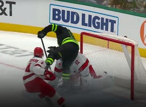 The second period was more of a product you consider paying for. It started when Wyatt Johnston fed Dadonov on a four-man of the Stars’, and Dadonov just ran out of room before trying to feed the puck back in from below the goal line, after miraculously keeping his balance to begin with after the pass: