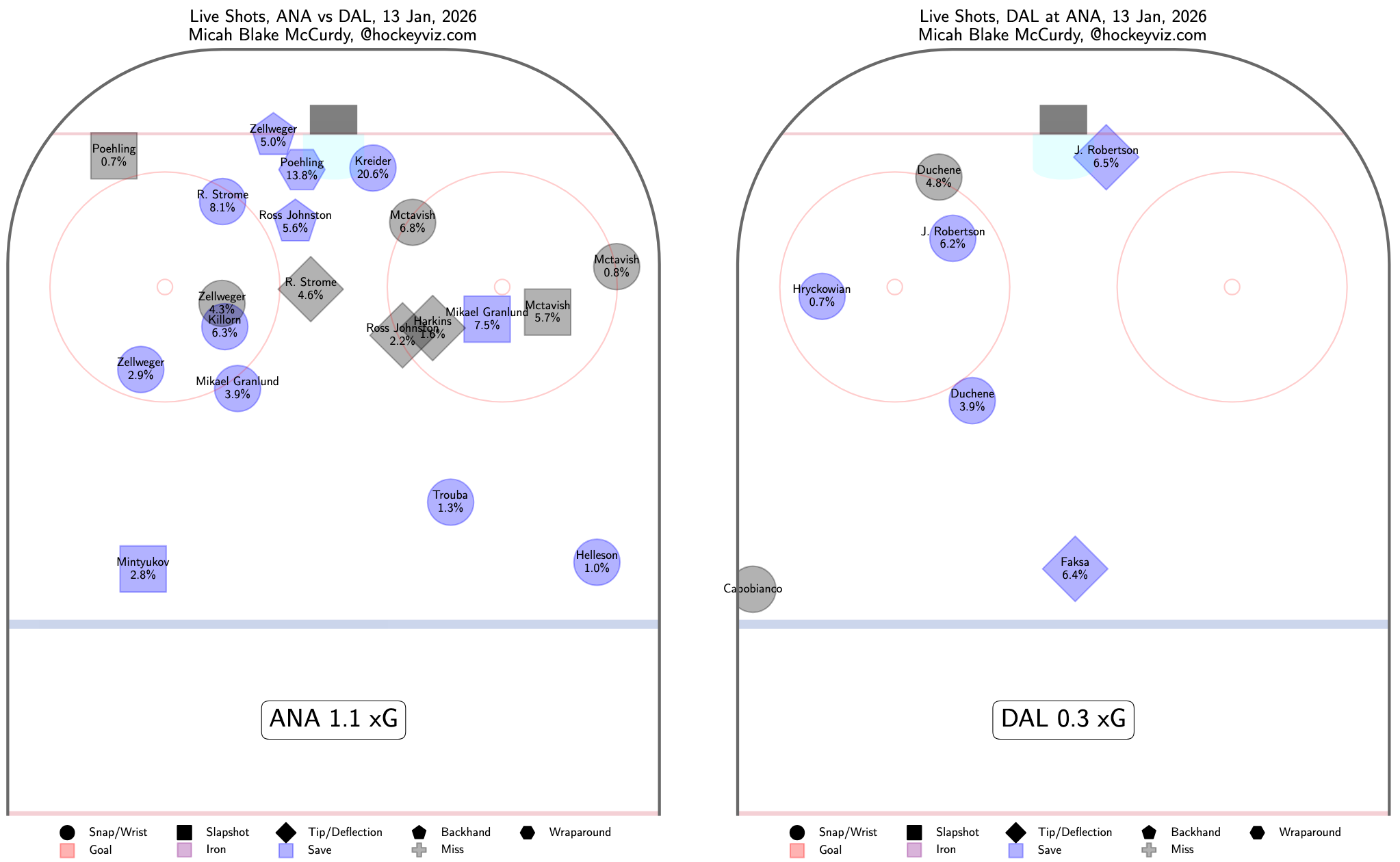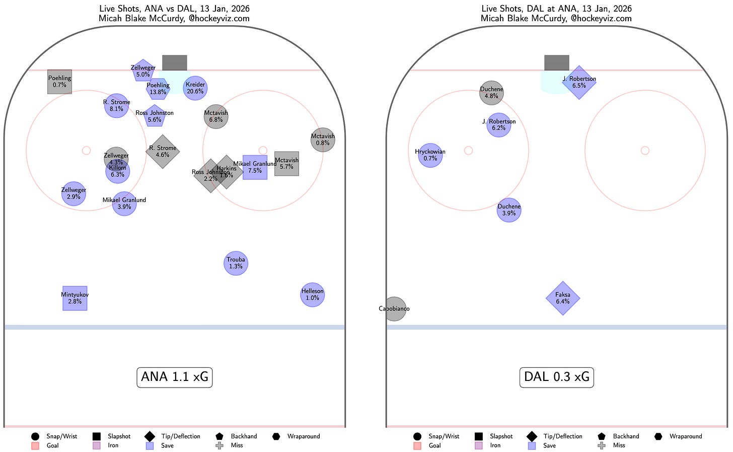 It was not a very cohesive first period for Dallas, is what we’re saying here. But because it’s the 2025-26 Dallas Stars, the Ducks didn’t find a way to convert any of those chances, and the Stars remained in the game a whole lot longer than most teams would have any right to do.