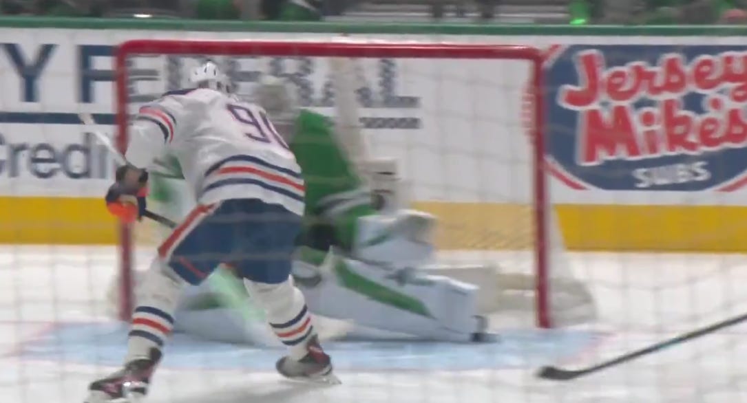 Then two minutes and one second later, Hintz sets up Thomas Harley for a one-timer that feels dangerous. Harley will hammer the puck into Ekholm, and the puck will head out to the neutral zone, where a fresh Connor McDavid and Roope Hintz race up the ice, with Hintz actually catching McDavid. But catching McDavid and stopping him are two entirely different things, and the best player in the world fends off the backchecker while also dekeing and bypassing your backup goaltender, and he scores what will turn out to be the game-winning goal.