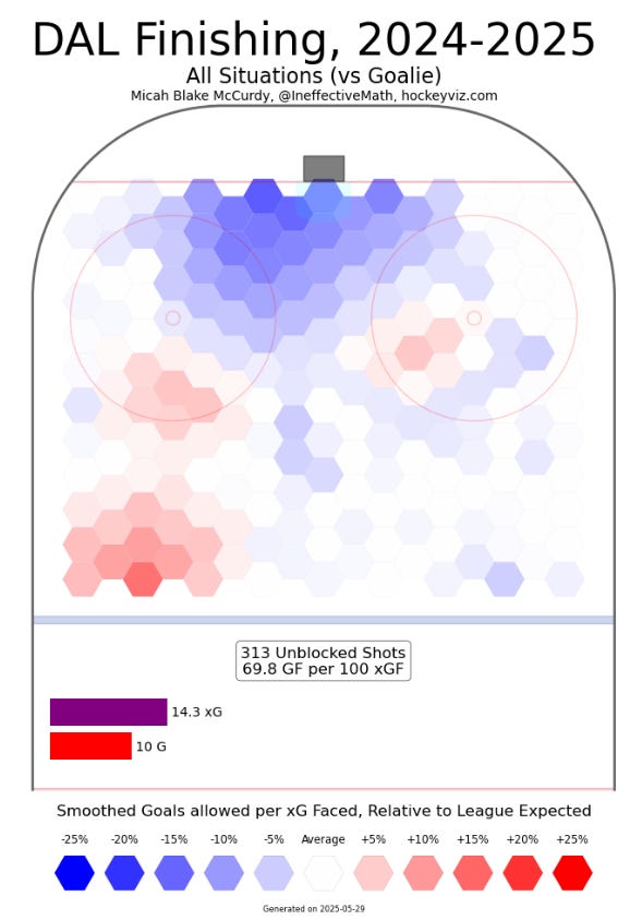 That chart isn’t perfect, as Micah or any other member of the analytic cognoscenti would tell you. No chart is intended to tell the entire story of every goal, but with a growing sample size (a phrase DeBoer mentioned when talking about Oettinger’s goaltending all the way back to last year’s Edmonton series), one thing was clear: Dallas was suffering disproportionately for the chances they were allowing.