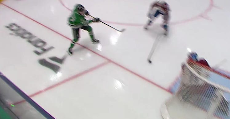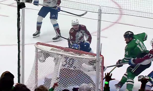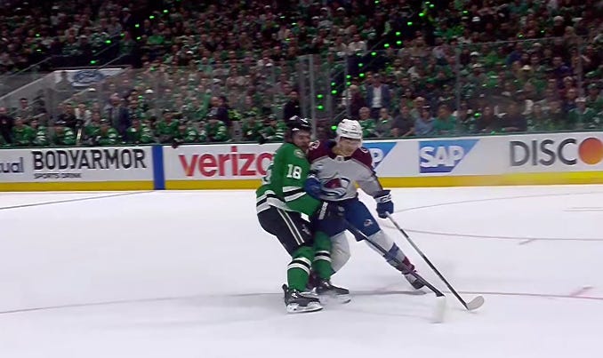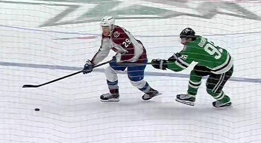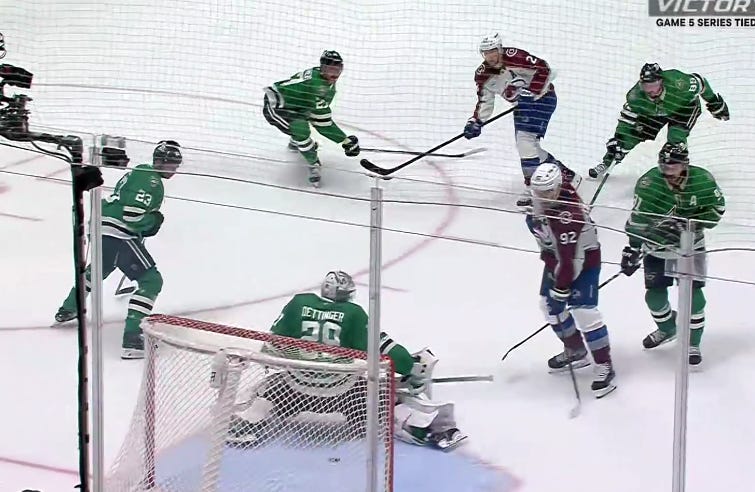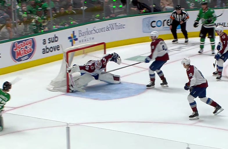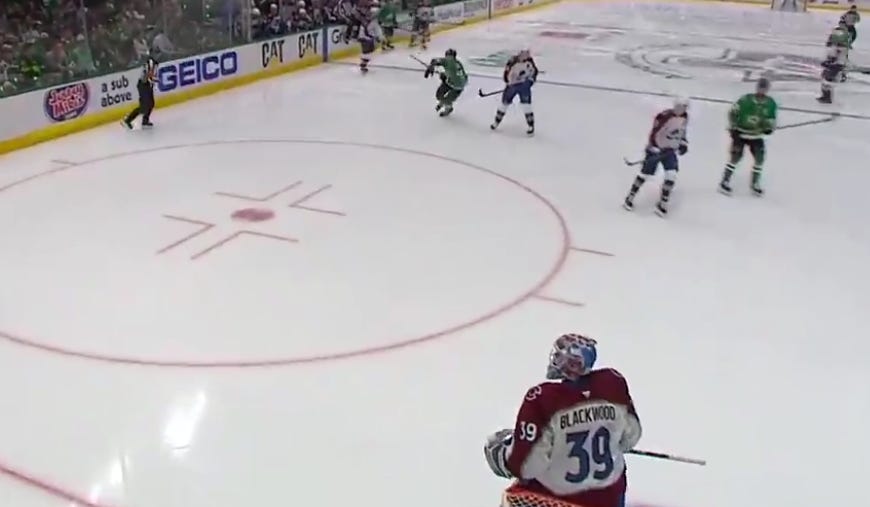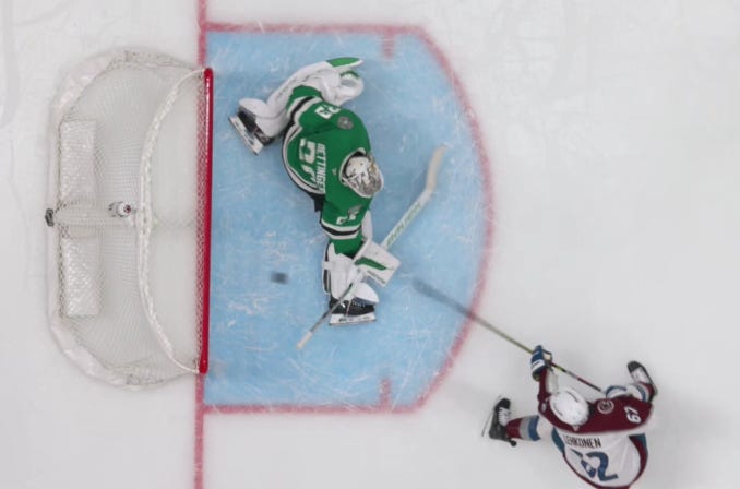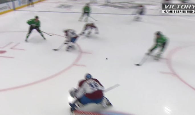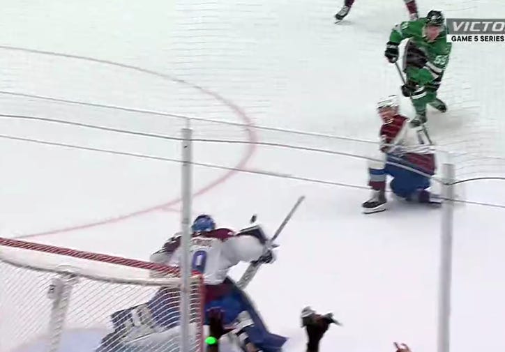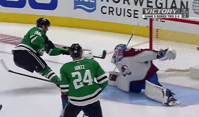 Dallas got off to a similarly hot start in the second period, as they caught Colorado pressing a bit too hard, and despite the most blatant hooking on Granlund you’ll ever see to slow him down, Hintz and Rantanen still managed to race ahead with a 2-on-1 against just Sam Girard.