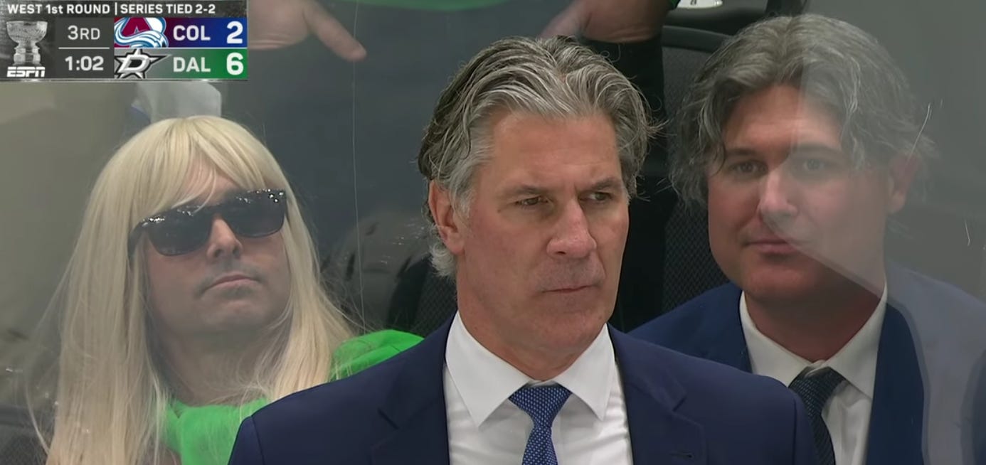 A fan behind the Avalanche bench in Dallas dressed up as Jared Bednar for this game.