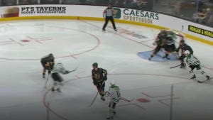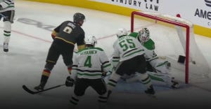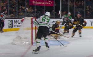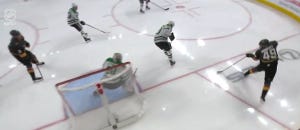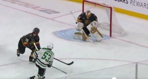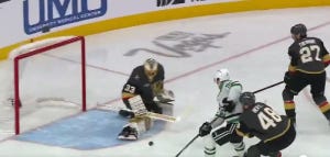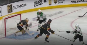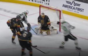 Three of the first four shots on goal in this game went into the net, though one was called back for being offside. Nonetheless, Oettinger could have been pulled early in this one, but he and the Stars shored things up after the early scramble, and a 2-1 deficit was probably no worse than they deserved, all things considered. And despite Vegas scoring a 5-on-3 goal to make it 3-1 the next period, it would end up being Oettinger who came up huge down the stretch, including a big save on a shorthanded breakaway. He also made a very tricky save late in the third period after a deflection, but we have to talk about the absolutely massive save on Shea Theodore on a breakaway right at the beginning of overtime.