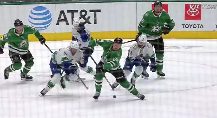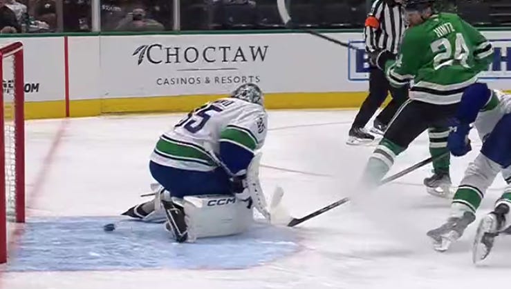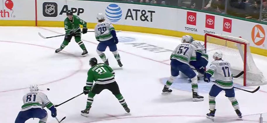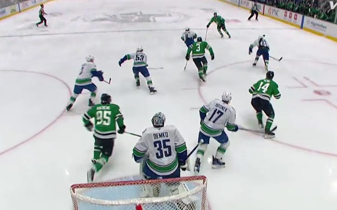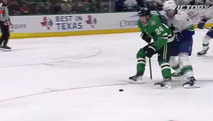 Lian Bichsel decided to join the Bottom-Three-Defensemen Penalty Club with a high-stick on Elias Pettersson, but Alain Nasreddine’s Special Teams sponsored a fourth successful kill. You really couldn’t say enough about how effective the Stars’ penalty kill was in a game it was badly needed, but then again, Vancouver’s lack of J.T. Miller on the power play probably didn’t help the Canucks’ cause, either.