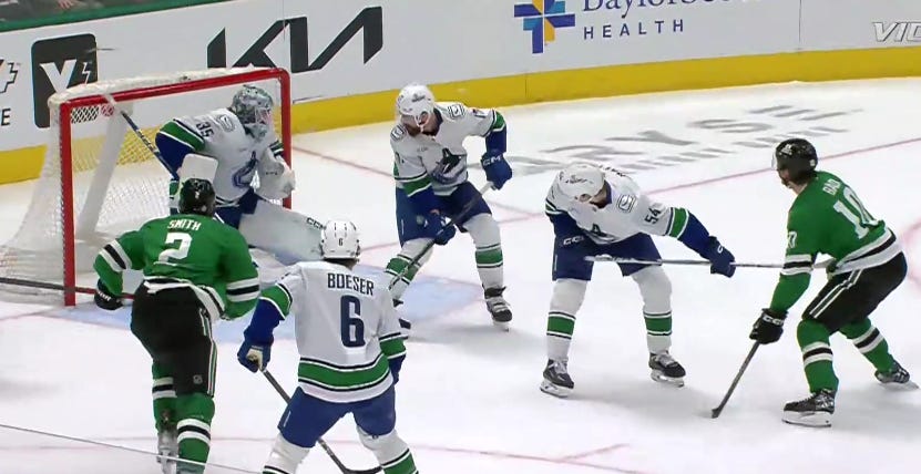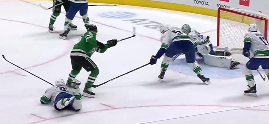 With 3:30 remaining in the game, Brendan Smith took a penalty, but he clearly had everything planned out ahead of time, because the Stars won the face-off immediately, and Roope Hintz sent it the length of the ice and into the empty net to make it 4-1 and crush any hope Vancouver had remaining.