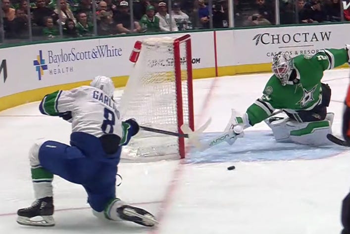 But Nils Hoglander would end up feeding Connor Garland on the far side, and he did a great job to take a moment and ensure he had the puck before sliding it into a nearly-open net: