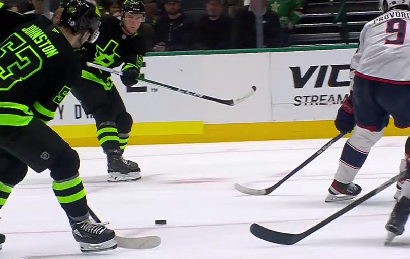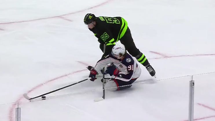 After Thomas Harley turned the puck over with a great bit of, I guess, forechecking? By a defenseman? at 5-on-5? Yeah, it was delighftul. Harley harassed Johnson with persistence, and the Columbus forward ran himself out of room until Harley finally just got inside position and knocked him down on what Columbus probably wanted to see called hooking, but was really just a great play by a defenseman on a forward who wasn’t ready for that sort of pressure, from that sort of player.