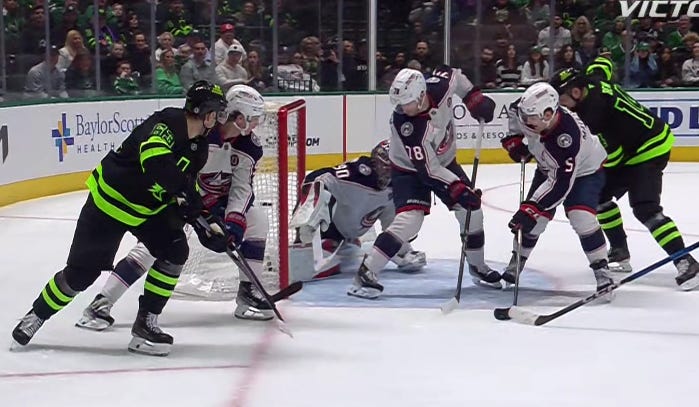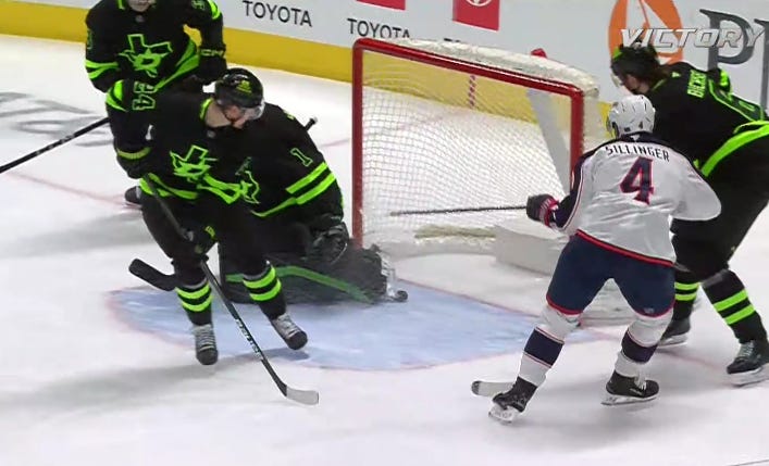 It actually started with a good stand-up hit by Dumba on Zach Werenski, but Bichsel wasn’t decisive enough on the subsequent loose puck, and Columbus took over from there, circling the net and pulling Dallas out of every position imaginable until Ivan Provorov finally sent a shot past DeSmith’s blocker from a too-open spot in the high slot past a too-screen DeSmith to regain the lead. It was Dumba’s fifth goal against in the last six goals the Stars had surrendered.