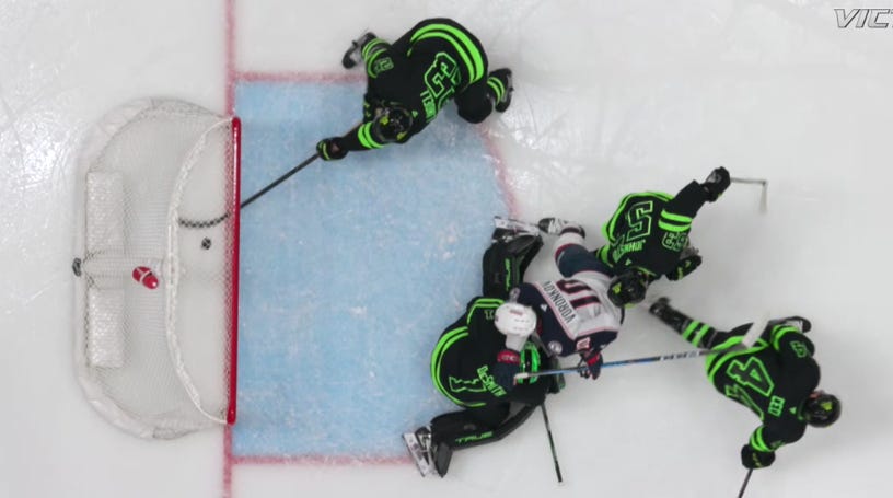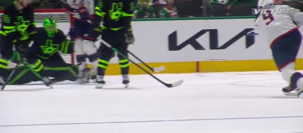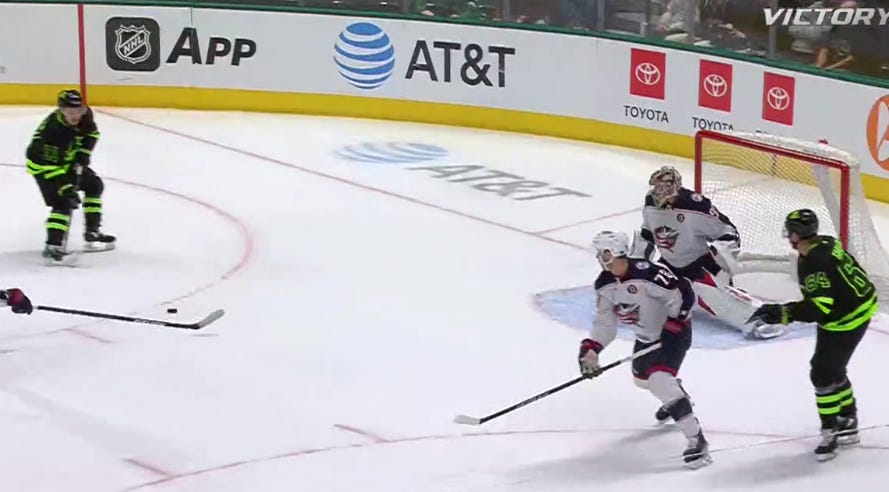 Kirill Marchenko (would lose some teeth in this game after taking a puck to the face while on the bench) rang the post on the very next shift though, reminding Dallas that Columbus is very much On One These Days. This isn’t Vancouver, in other words.