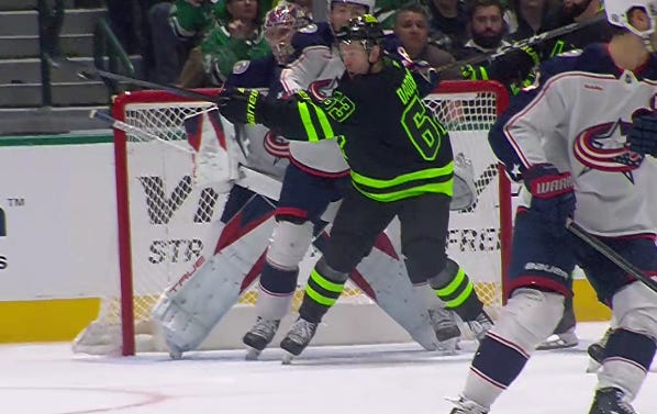 That included a surprising call on a high-stick review, as Evgenii Dadonov expertly pulled a Harley shot that was going high and wide back into Merzlikins’ body and under his arm to put Dallas up 4-3.