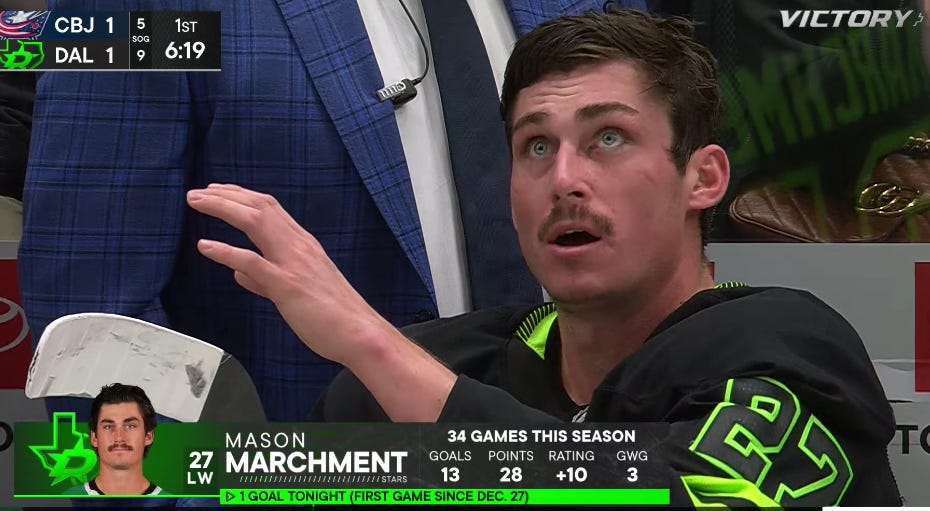 As for the new folks, what can you say? Mason Marchment scored the Stars’ first goal after getting his nose “shattered” (his words) and having to wait for the swelling to go down enough so he could breathe through his nose again, which is important for professional athletes, as you can imagine.