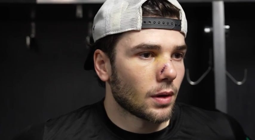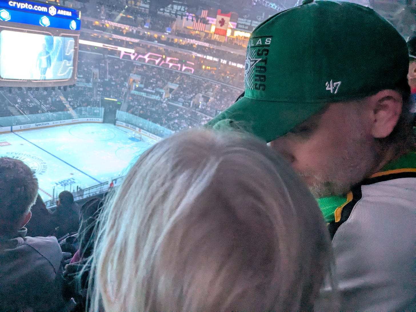 Alex Laferriere then scores a goal after Jake Oettinger gets a blocker on a Quiton Byfield shot, only for the rebound off the end boards to come imporably back toward the Stars’ goalie, bouncing off his lower leg pad and lying in the crease like an hors d'oeuvres that a diving Dumba can’t save (and never should have had to). E is noticing, at this point, that any time there is loud noise, it’s bad news for the team in green. I do not ask her opinion about the Darkness music, but I’d wager that she would probably have axed it, too.