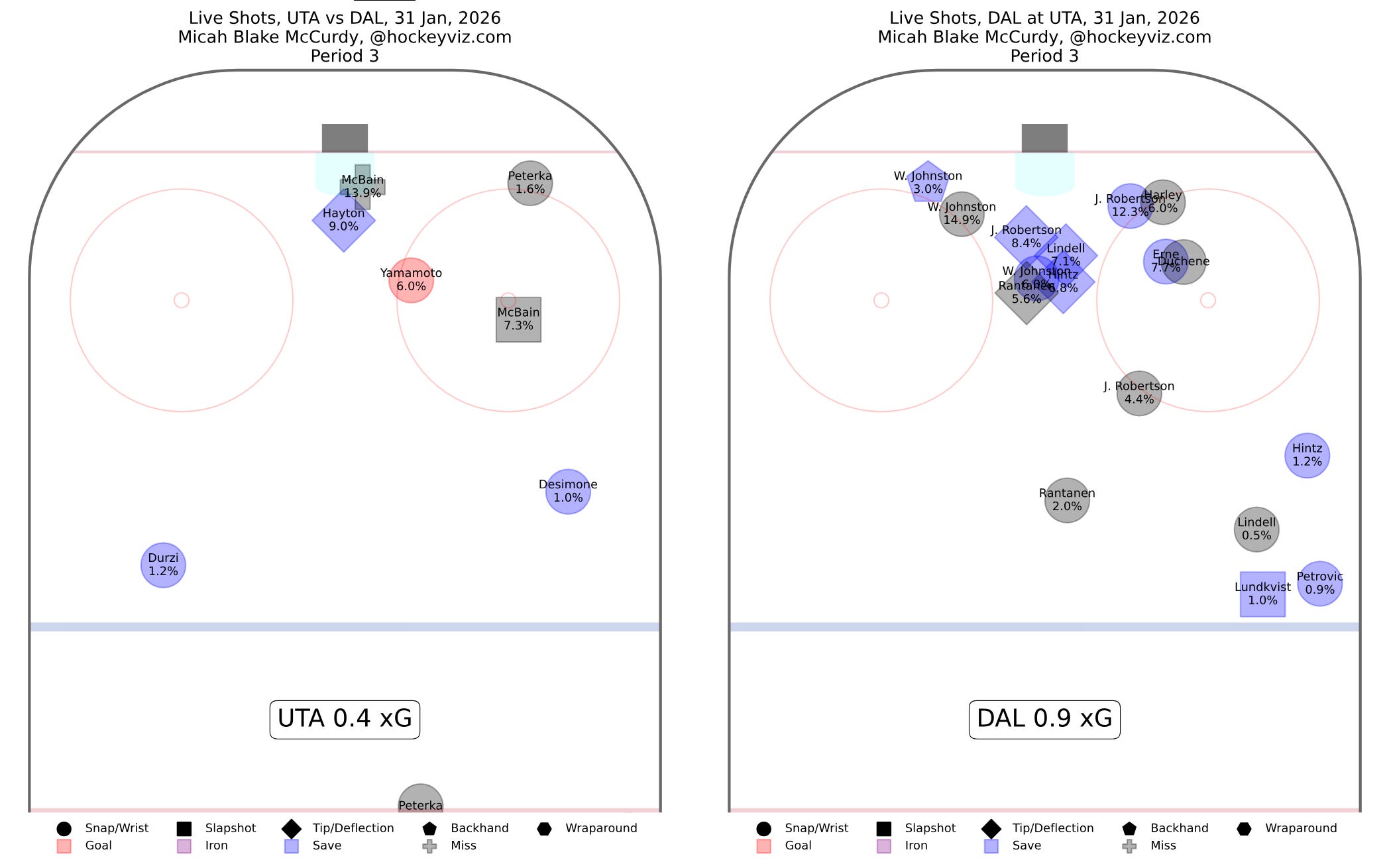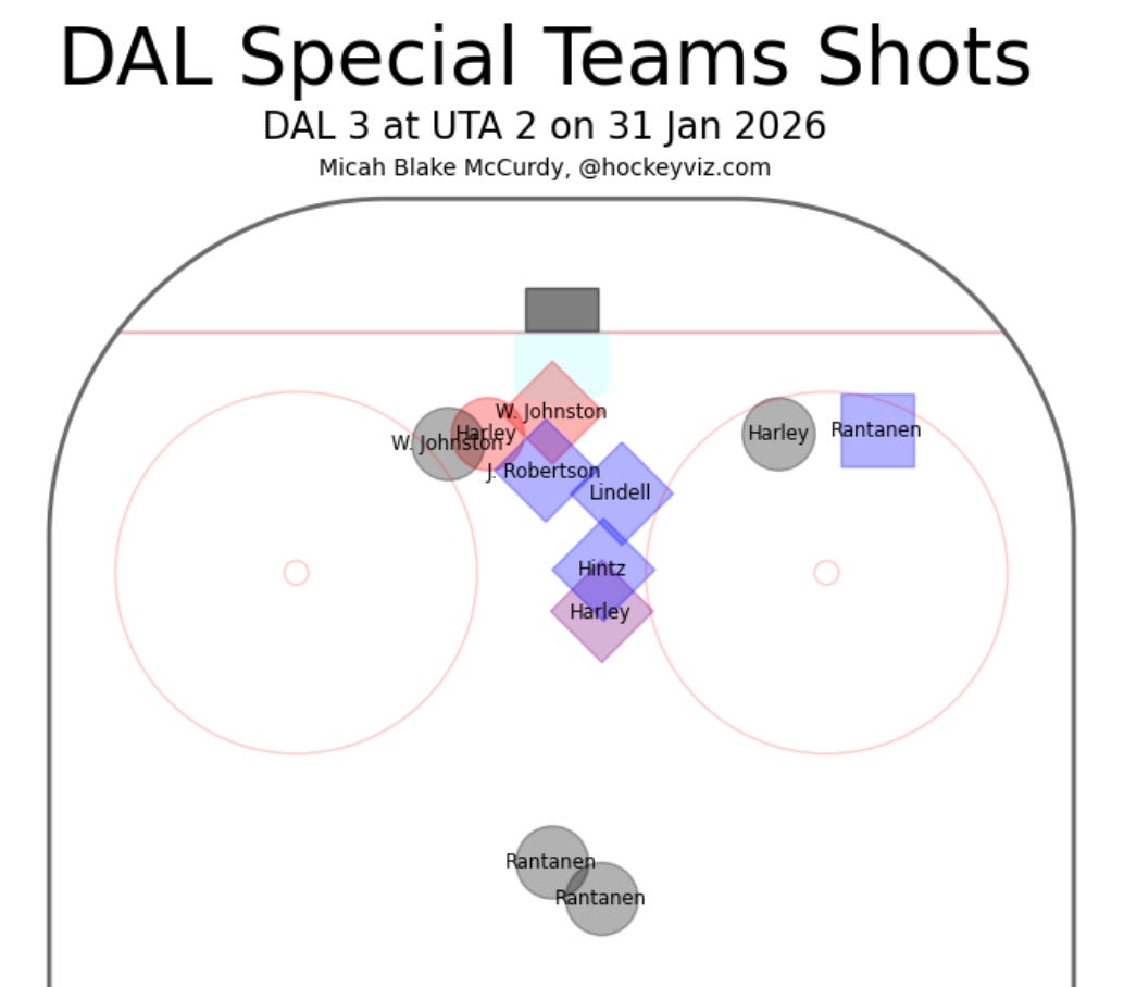 That intensity probably didn’t hurt when it came to defending yet another multi-goal lead in the third period. But with that 3-1 lead going into the final 20 minutes, Dallas played a very solid third period, outchancing Utah by a 2-to-1 margin (albeit with those couple of mistakes). Here’s what that period looked like: