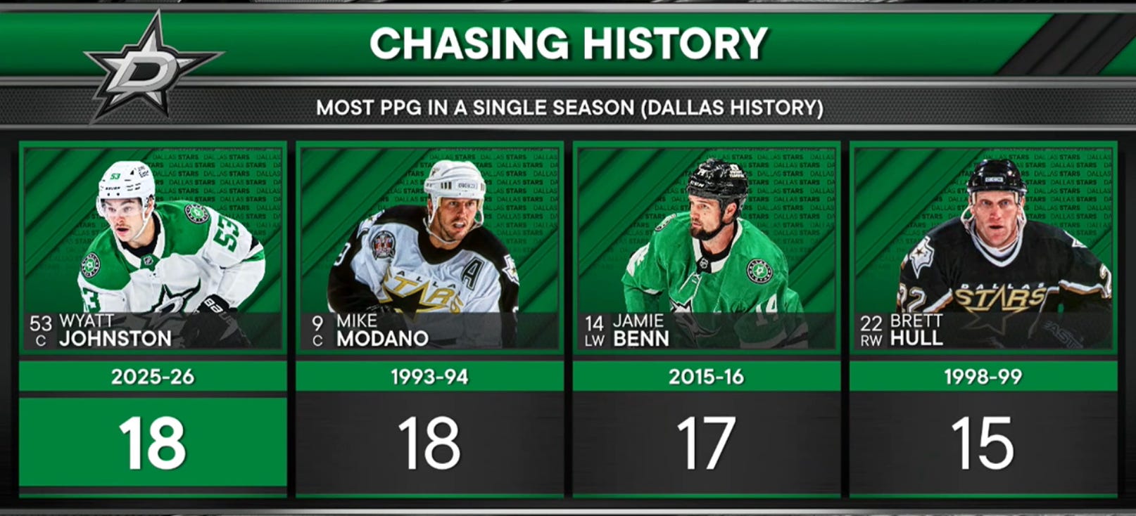 Just FYI, here’s where Wyatt Johnston is in Franchise History in power play goals, per Victory+: