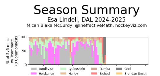 I don’t think Lindell-Lyubushkin is an optimal playoff defense pair, and I think Nasreddine and DeBoer know it. Those two have primarily played together on the penalty kill this year, and rarely for the majority of a game (as you can see from the sea-green bars, below).