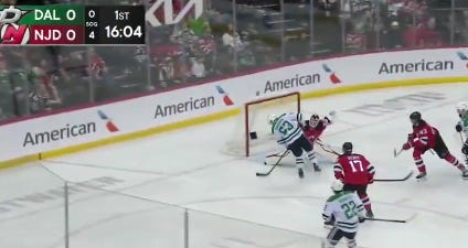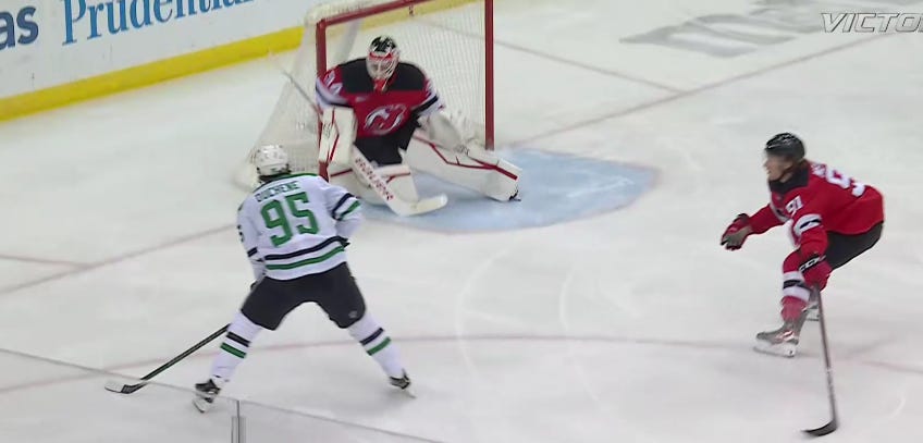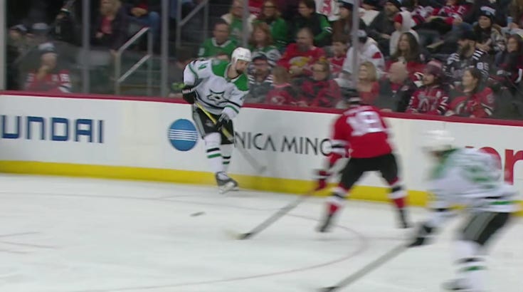 Dallas continued to stretch the neutral zone in the third, with a forward at the far blue line forcing New Jersey to keep a defenseman back there during breakouts, giving Dallas some more room to work with.