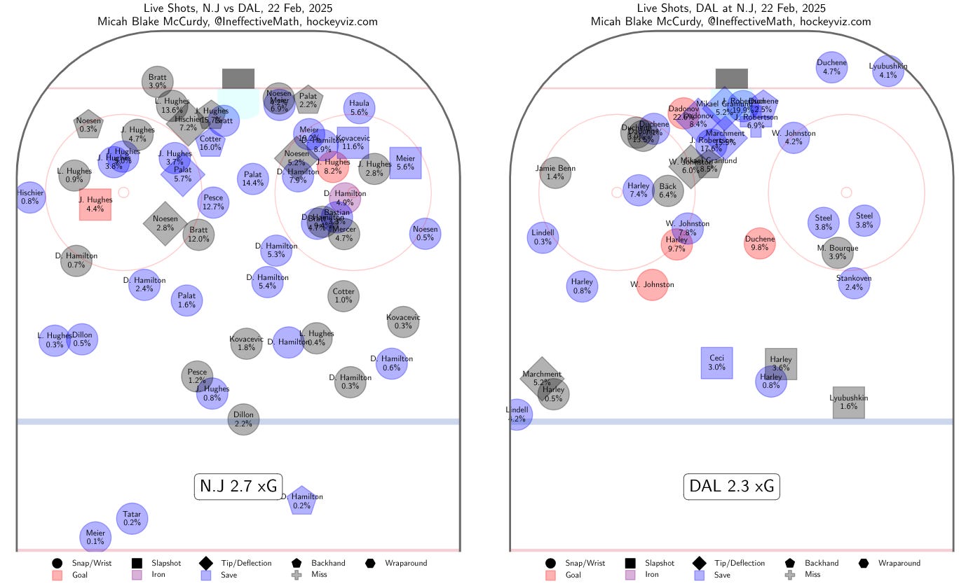 That doesn’t mean they weren’t testing Dallas, though. But Casey DeSmith had a truly fantastic game, stopping everything he saw outside of Jack Hughes’s best chances, as you can see from the Devils’ shots (in the left picture below)