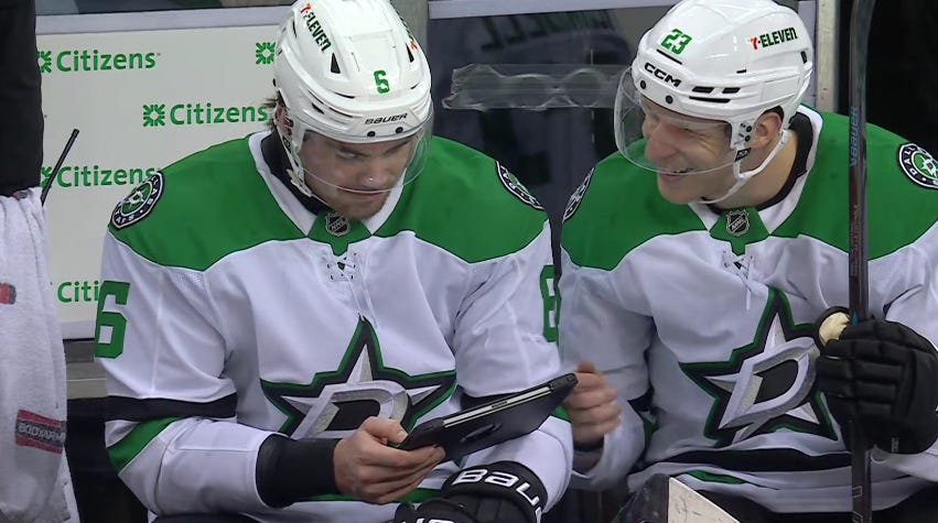Here’s a shot that someone on Twitter directed me to where you can see Esa Lindell very likely laughing at Lian Bichsel’s massive hit on Dawson Mercer. It’s always nice to watch fun shows with your friends.
