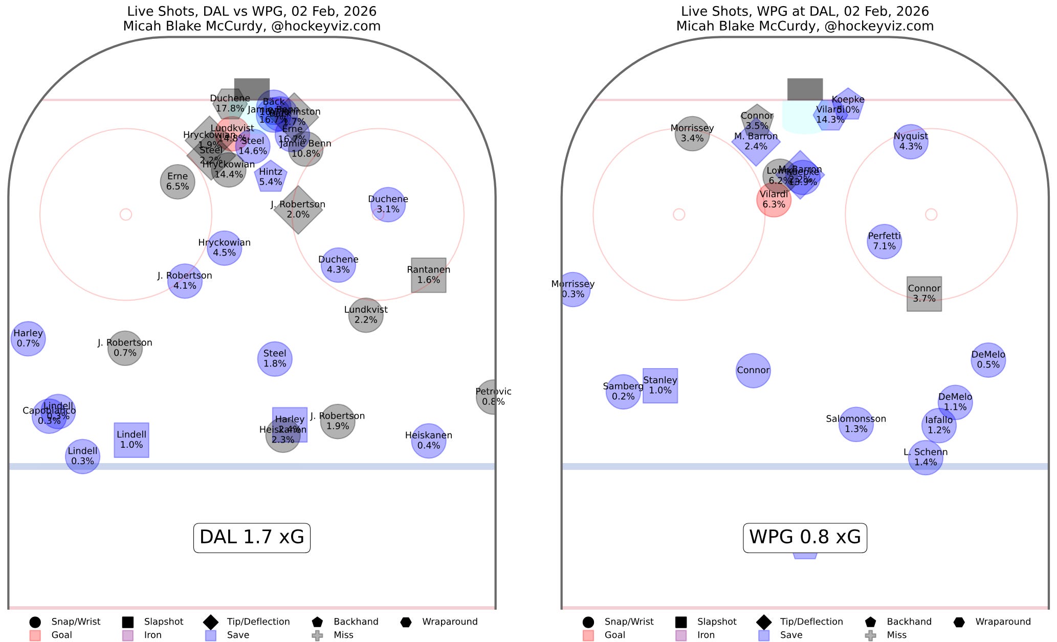 With ten minutes to go, Dallas had out-attempted Winnipeg pretty handily at even-strength, as this shot chart shows. But the grey shapes are missed shots, and Dallas also handily out-missed Winnipeg, which made Hellebuyck’s night easier than it probably ought to have been: