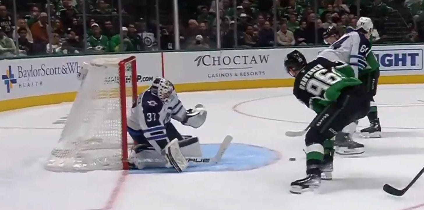 I’d imagine Hellebuyck’s protestations died down during Scheifele’s breakaway right after this clip, only to ramp back up again when Dallas got the puck and came down the other way. I’d say he has a legitimate gripe, but I don’t expect most Stars fans or playerswill feel too sympathetic to his cause. And even Scott Arniel acknowledged that really, the Jets had the game on their sticks.