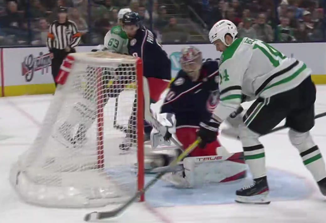 A really smart Wyatt Johnston pass found Jamie Benn at the back door, and Benn corralled the hot pass below the goal line and got it into the crease without much resistance, other than some flailing by Merzlikins that didn’t prevent the puck from trickling in. Interestingly, Benn wasn’t credited with a shot on goal, as Merzlikins ended up knocking the puck into the net himself.