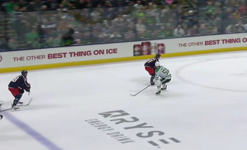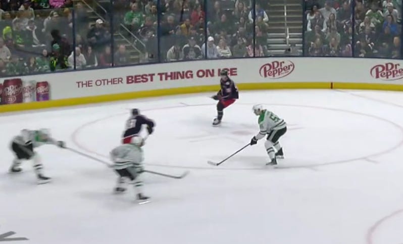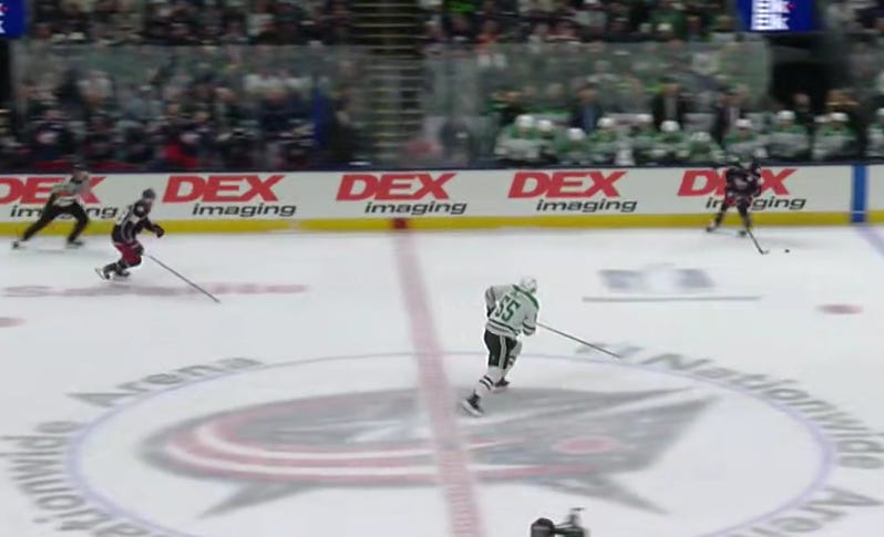 First, you can see Kent Johnson gets the puck by the benches, as the initial zone entry by Dallas was refuted so quickly that not all five Jackets had gotten back to the zone.