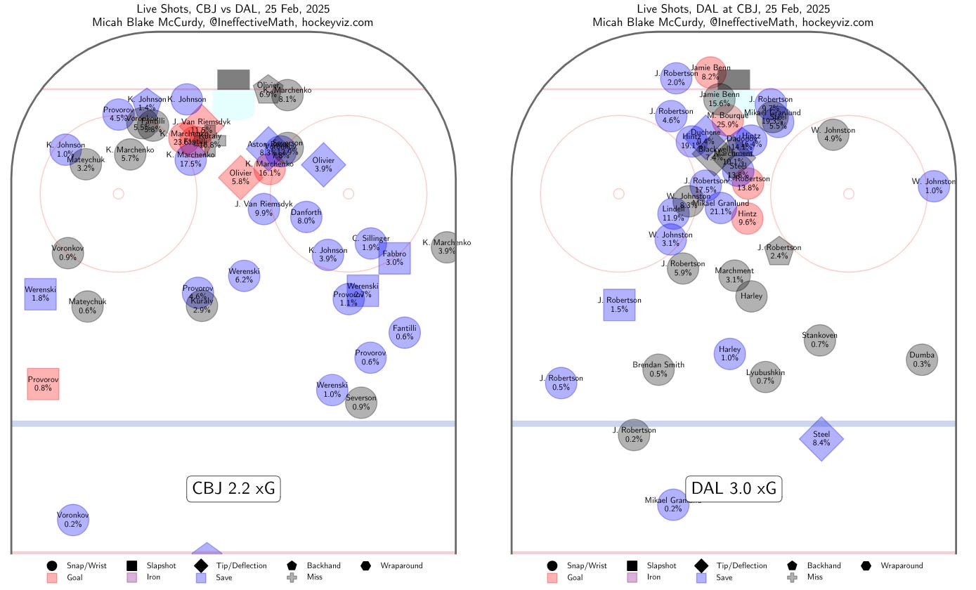 That is a plot of both team’s shot locations, with the Stars’ shots on the right. And you can see just how much they refused to shoot from almost anywhere outside the slot. For good or bad, the Stars look for high-quality shots, and usually it works for them. Tonight, they needed just one of those clunky ones that Columbus got, as Merzlikins looked far from impenetrable, particularly when it came to rebounds. But he also had a couple of nifty saves, including a glove-hand spectacular on Sam Steel, so maybe I’m underselling him on a night where he gave up four goals. And maybe the Stars know what they’re doing, and we should all stop yelling “shooooot” except as a euphemism in moments of anger (like when you step on a rake).