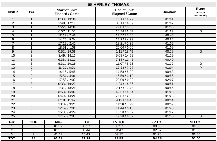 With the defense pairings as thin as they’ve been since the Stars recalled Kyle Capobianco a few weeks back, you always knew Harley was likely to get a lot of minutes, but man. He got a lot of minutes. In the third period, Harley was averaging 1:11 per shift. Esa Lindell had the second-highest average on defense, and he was almost 20 seconds less than Harley, at 53 seconds a pop. Here’s Harley’s shift chart: